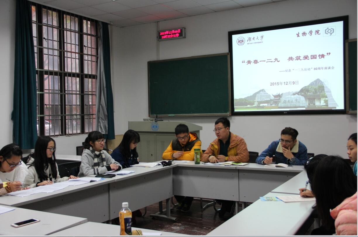 12月9日下午,bat365中文官网入口研究生会“青春“一二·九”,共筑爱国情”纪念“一二·九”运动80周年座谈会在中楼103教室举行,研究生会主要学生干部、硕士博士班班长等二十余人参加座谈会,研究生辅导员胡品老师参加座谈会并发言。座谈会由研究生会主席何壮同学主持。bat365中文官网入口2015级本科各班级的班长团支书也应邀列席座谈会。