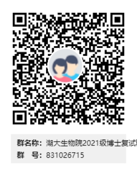 通过学院材料复审合格且有意愿参加本院考核、复试的考生请加入“湖大生物院2021级博士复试群”(简称“复试QQ群”),群号:831026715,相关通知将在群内发布,请务必加入!不参加本院复试的考生勿扰。